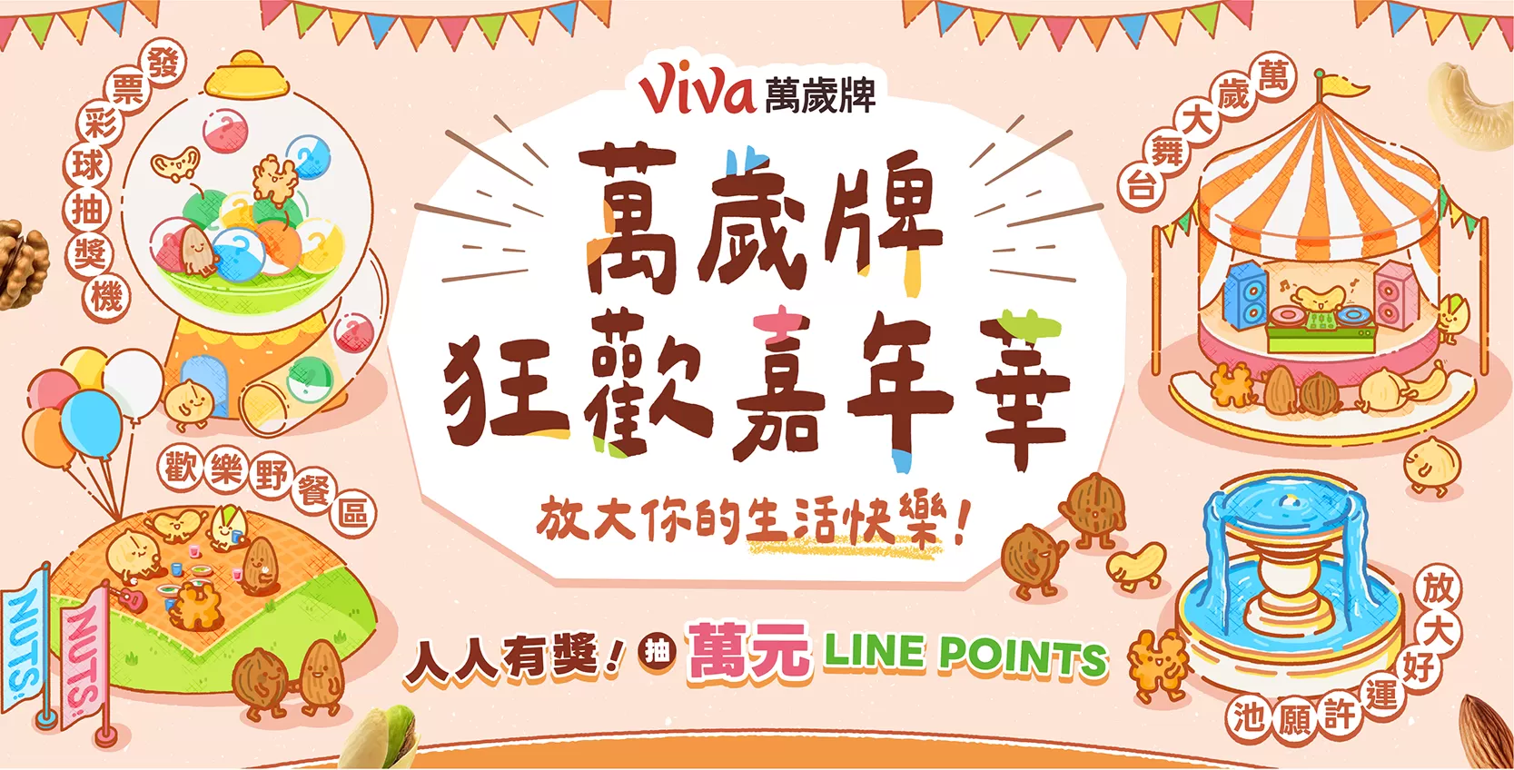 活動期間加入「LINE官方帳號」,填寫完畢「填資料,抽好禮」問卷,可獲得抽獎券乙張,完成指定關卡(「歡樂野餐區」、「堅果變裝間」),可再獲得抽獎券乙張(兩關各可獲得乙張,可累計),並有機會抽中「萬歲牌堅果箱」。