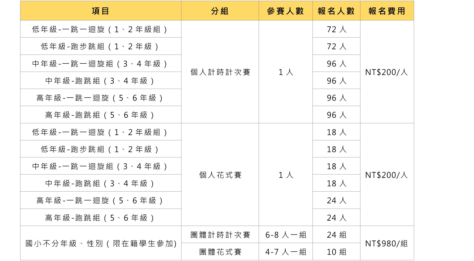 • 中低年級個人項目依照組別分配不分性別,高年級個人項目統一採用跑步跳並依性別分組,團體項目則不限年級及性別