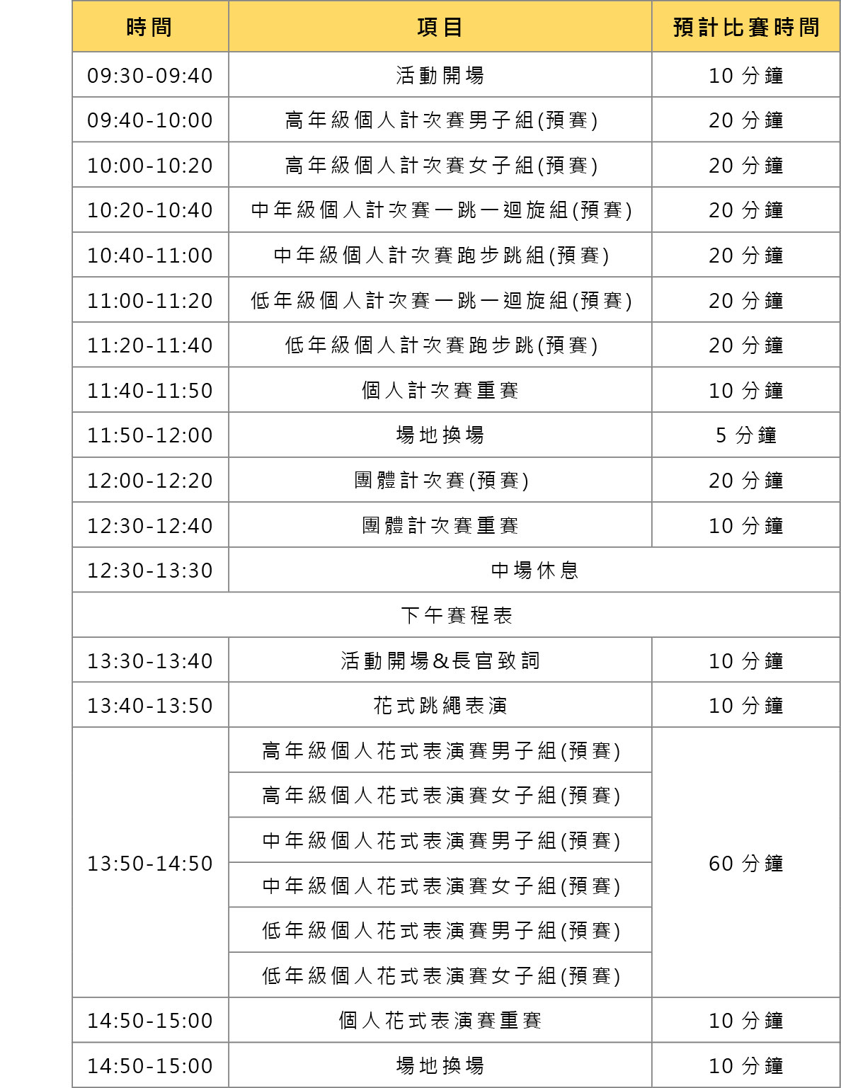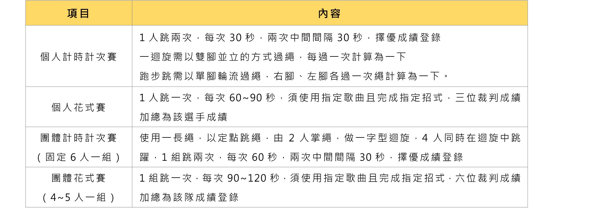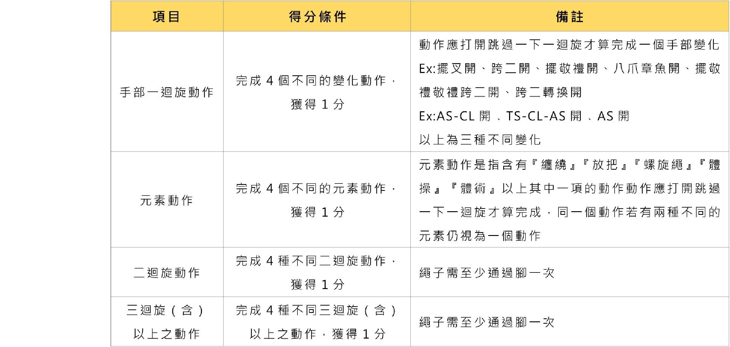 3. 大會提供用繩只提供固定長度 個人繩2.5米 團體長繩 10米,選手需自行調整。