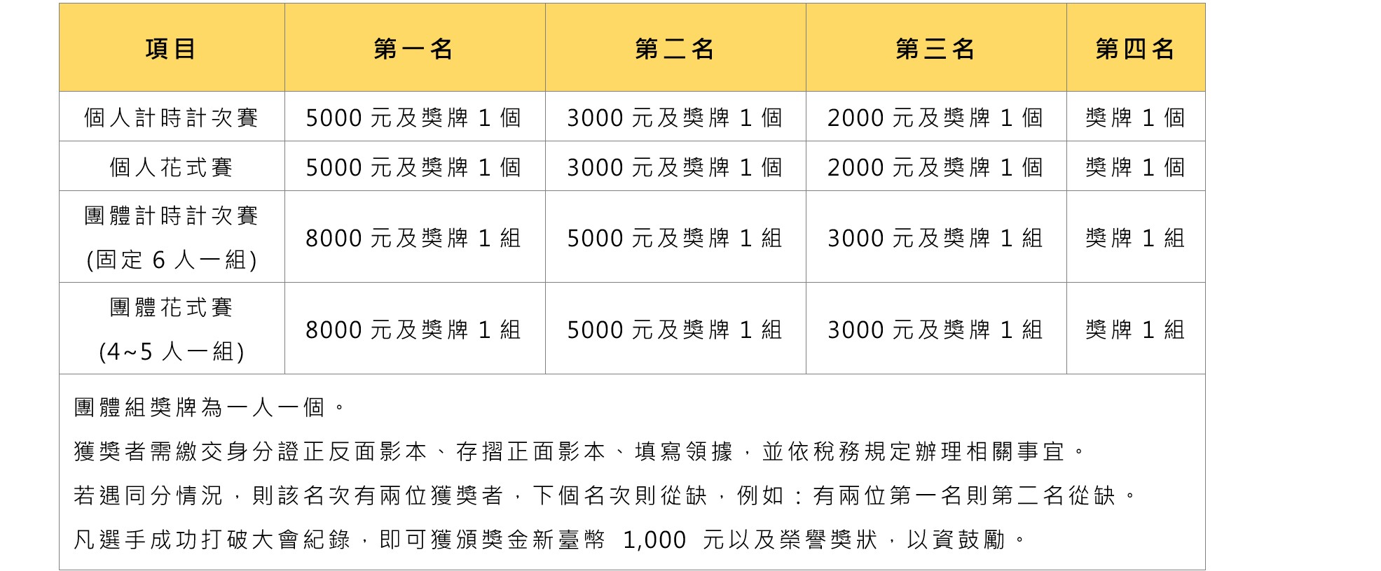 6. 凡各隊任一參賽者超報項目時,依序取消其個人計時計次賽、個人花式賽、團體計時計次賽、 團體花式賽。