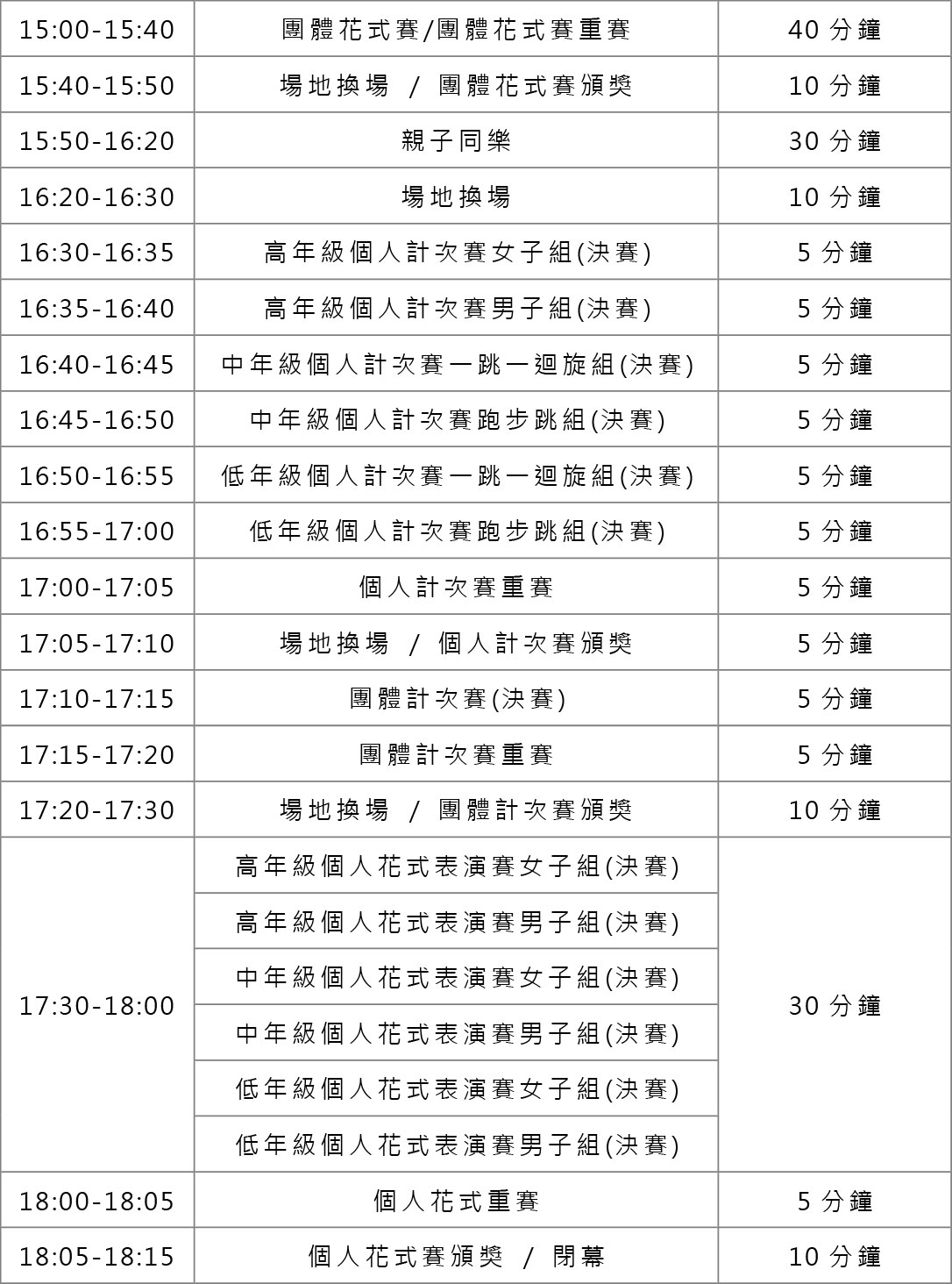 3. 競賽過程中如發生繩子斷裂、解體等『跳繩器材』上的意外事故發生,請參賽者原地蹲下等候比賽結束,離場時直接到申訴處