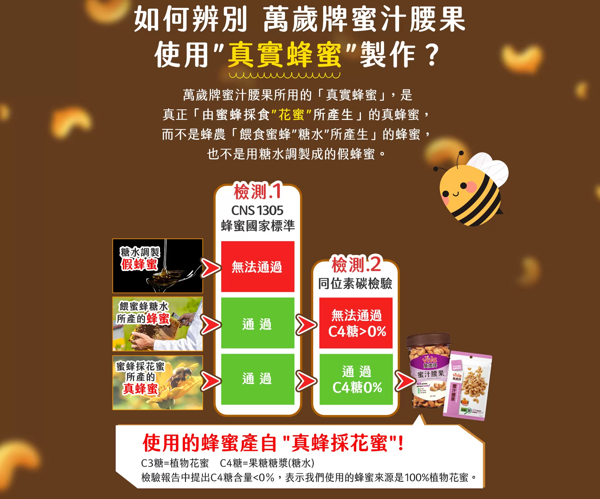 萬歲牌堅果原料,皆是聯華食品採購團隊親臨世界各地堅果產地所精心挑選,並在生產製程上持續不斷精進,堅持提供最優異的堅果品質,多年來深受消費者喜愛,成為眾所周知的台灣堅果第一品牌。產品開發方面,萬歲牌持續推陳出新,從純堅果到混搭果乾、小魚等原料,從不同調味方式滿足消費者口慾,從堅果隨手包到體面大方的堅果禮盒,更拓展到喝的堅果沖調飲,提供全家大小最健康的零食點心,讓大家吃得滿足又開心,盡情享受堅果的美味,Viva!堅果萬歲!