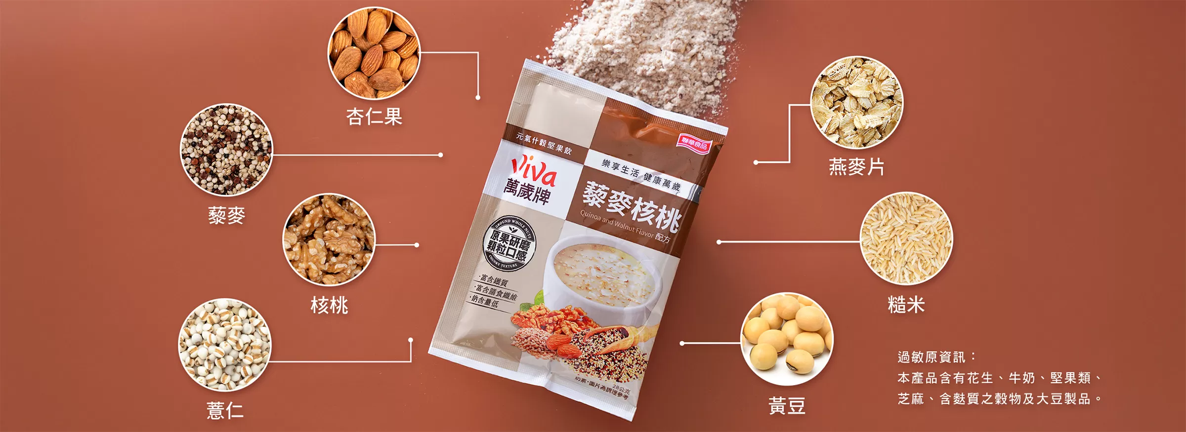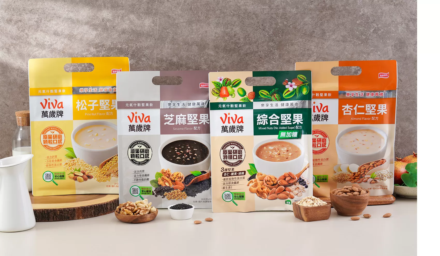 萬歲牌堅果原料,皆是聯華食品採購團隊親臨世界各地堅果產地所精心挑選,並在生產製程上持續不斷精進,堅持提供最優異的堅果品質,多年來深受消費者喜愛,成為眾所周知的台灣堅果第一品牌。產品開發方面,萬歲牌持續推陳出新,從純堅果到混搭果乾、小魚等原料,從不同調味方式滿足消費者口慾,從堅果隨手包到體面大方的堅果禮盒,更拓展到喝的堅果沖調飲,提供全家大小最健康的零食點心,讓大家吃得滿足又開心,盡情享受堅果的美味,Viva!堅果萬歲!
